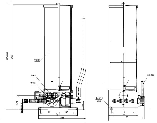 一、概 述 SRB-J7-4/4型手動干油泵適用于雙線式干油集中潤滑系統(tǒng)中,通過給油器向各潤滑點供送潤滑脂的手動潤滑泵。 SRB-J7-4/4型手動潤滑泵允許在0~40℃的環(huán)境溫度下工作,采用潤滑脂的針入度不低于265(25℃,150g)1/10mm。 二、形式、參數(shù)和尺寸 1、形式:SRB-J7-4/4型手動潤滑泵為帶有油位指示桿的手動柱塞式潤滑泵。 2、基本參數(shù)和外形尺寸: