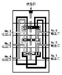 | 1、通過(guò)潤(rùn)滑泵加壓送出的潤(rùn)滑劑,經(jīng)供給口流入按圖示箭頭方向分別推動(dòng)活塞A、B、C 動(dòng)作。此時(shí)活塞A、B左腔在油壓的作用下處在右位不動(dòng),活塞C右腔進(jìn)入壓力,油開(kāi)始向左移動(dòng)。 |