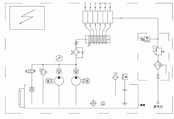 該站主要由油箱(帶電加熱器、液位計、電接點溫度計、空氣濾清器、液位控制器)、兩臺高壓油泵裝置(一備一用)、溢流閥、二位二通電磁閥、過濾器、單向閥、壓力表、KM型遞進式分配器、油氣混合器、壓力控制器及氣動三聯(lián)件和PLC電氣控制箱等組成。